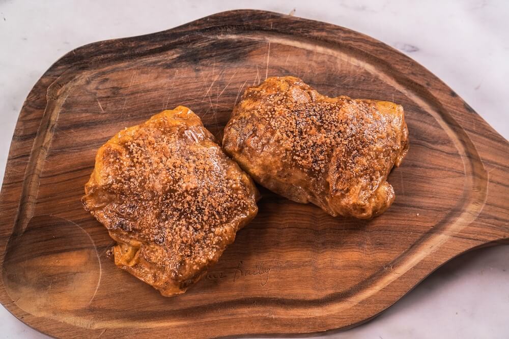 - Weiche Butter mit gepresster Knoblauchzehe vermischen, die Brioche Brote damit bestreichen und etwas geriebener Käse zum Toppen oben drauf.