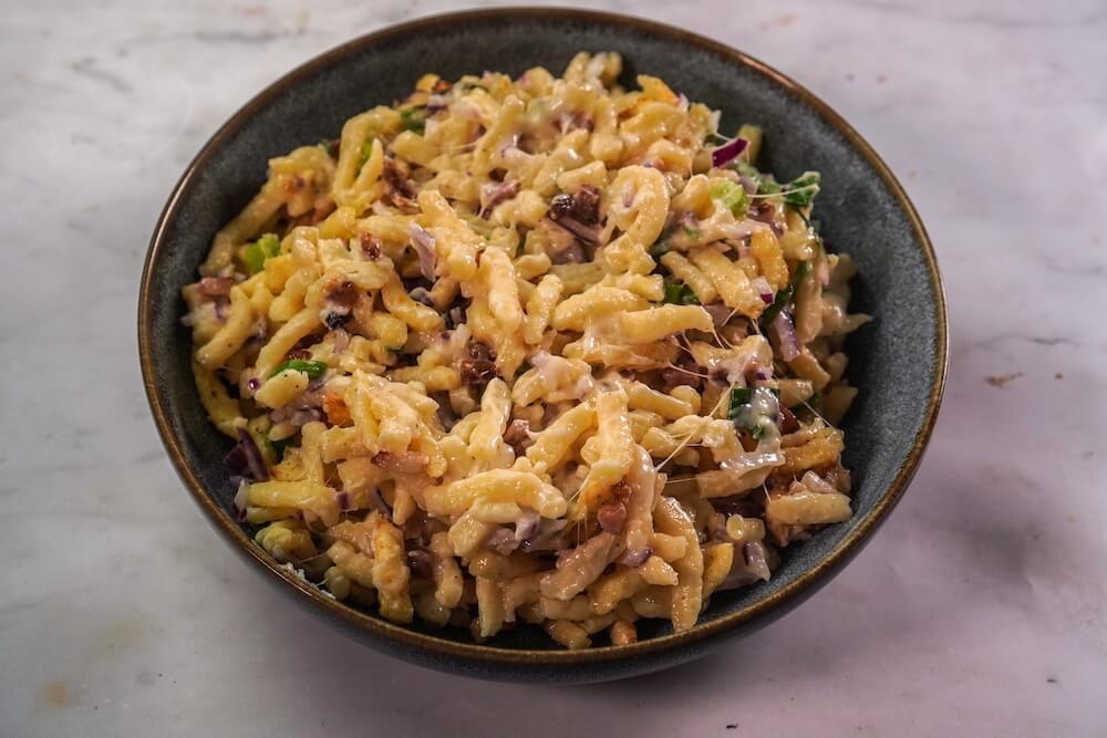 - Jetzt die Speckwürfel oben drauf geben, so werden die von einer Seite richtig knusprig.