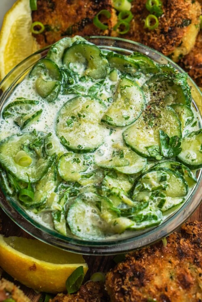 - Für den Gurkensalat die Gurken in Scheiben schneiden, mit Salz bestreuen und 10 Minuten ziehen lassen. Gurken, das Wasser abgießen und mit den restlichen Zutaten vermischen, abschmecken und bis zum servieren in den Kühlschrank stellen.