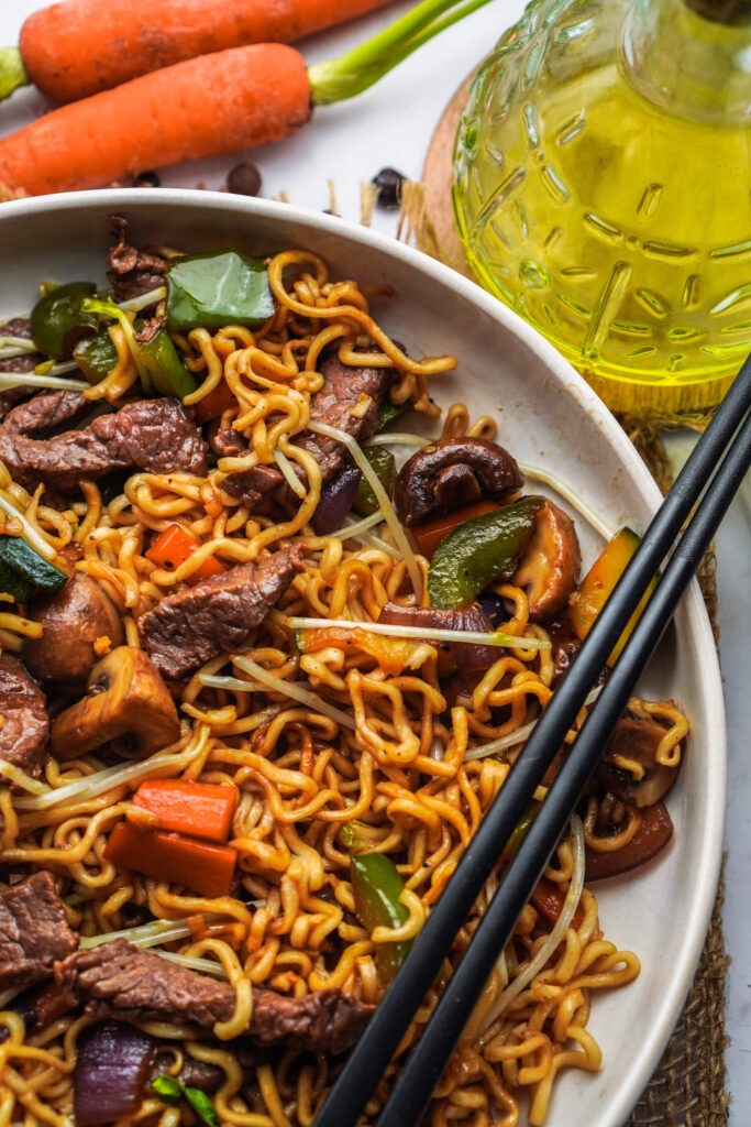 - Nudeln nach Packungsanleitung mit kochendem Wasser übergießen und ziehen lassen, dann abtropfen lassen und in die Pfanne geben. Durchmischen, fertig!