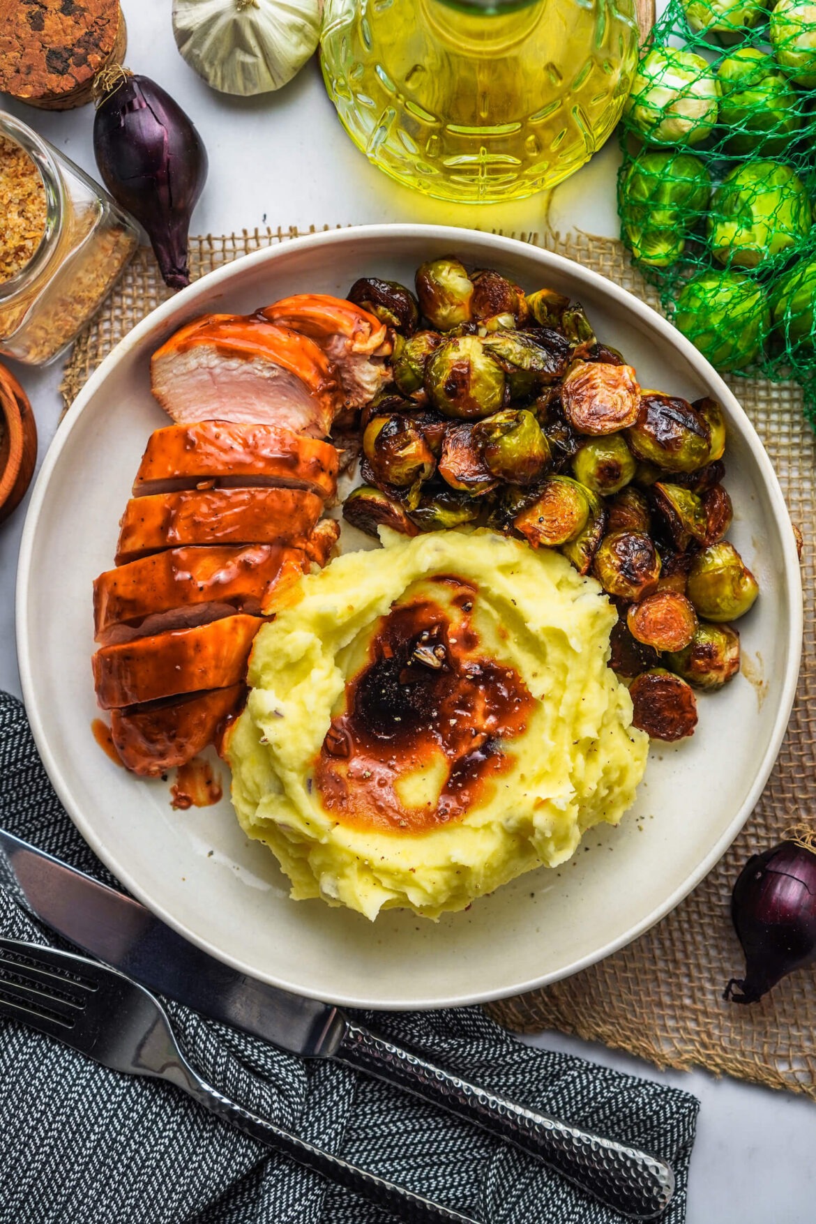BBQ Hähnchen mit Honig Soja Rosenkohl und Kartoffelpüree