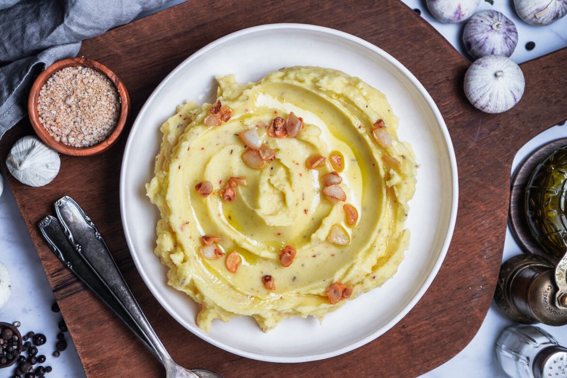 Milch nach und nach unterrühren, Salz, Pfeffer und Kartoffelknaller dazugeben, Knoblauch oben drauf, fertig!
