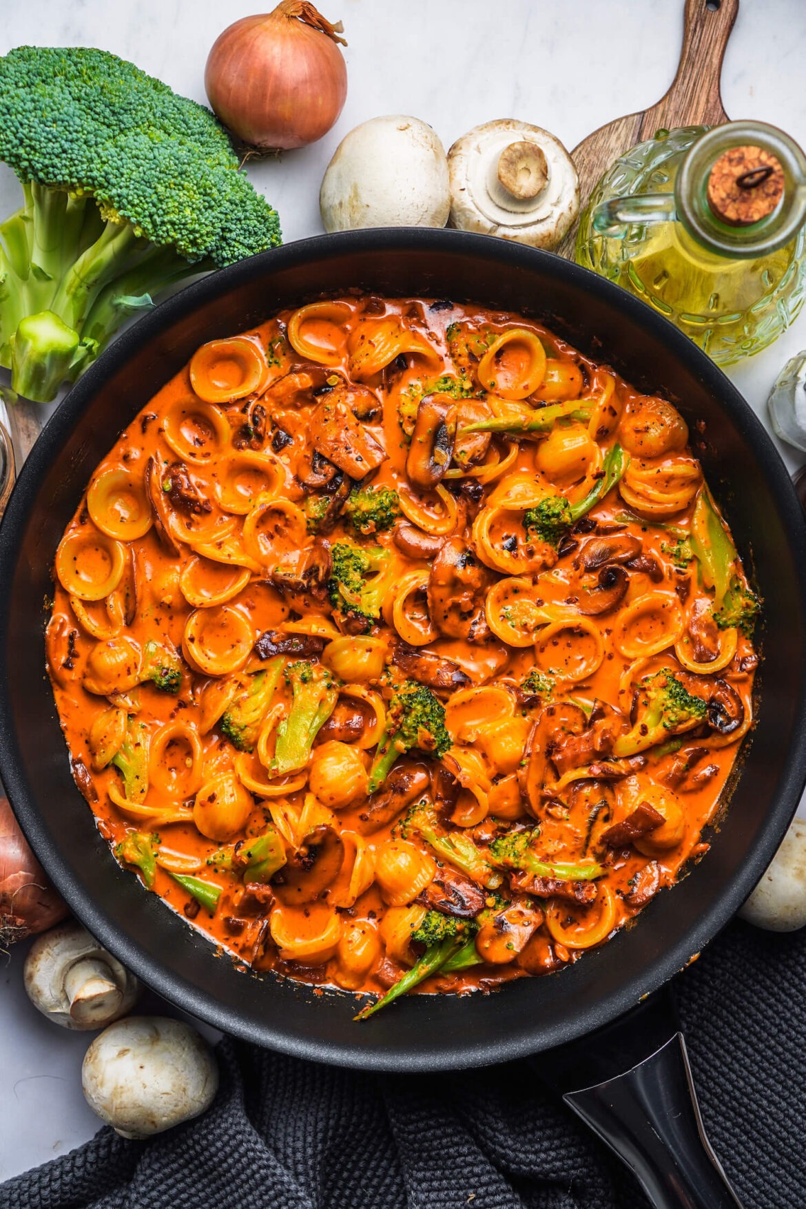 - Gehackte Zwiebel und Knoblauch zu den Pilzen geben, nach 2 min das Tomatenmark dazu und ebenfalls kurz anrösten. Brokkoli gewaschen und in kleinen Röschen mit zu den Nudeln geben, der kann dort mit garen.