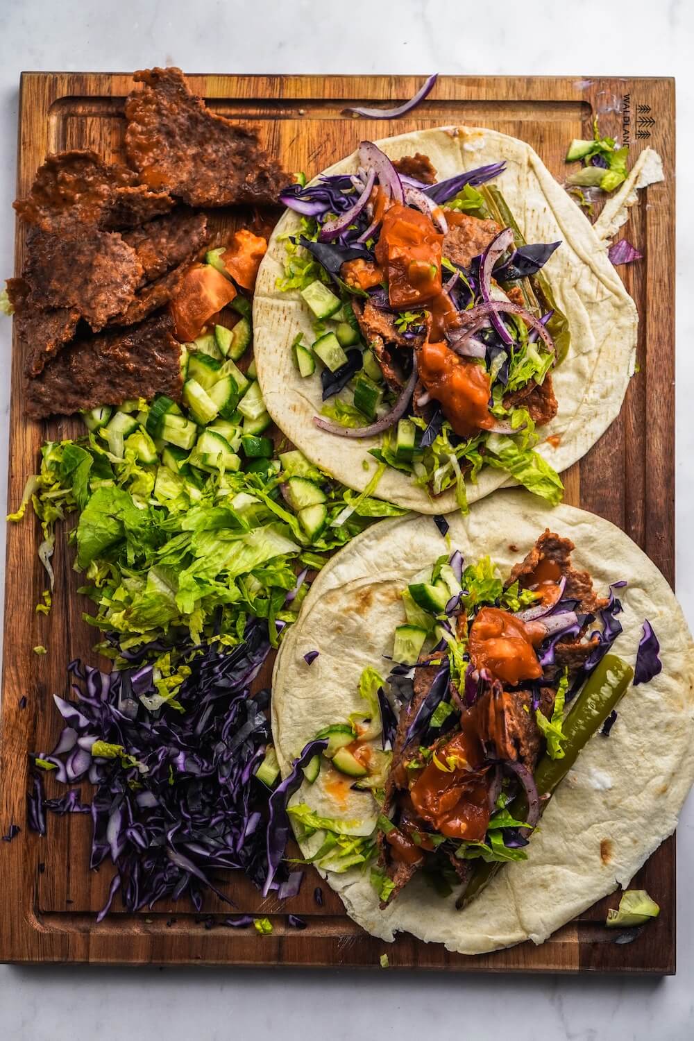 - Gewürze: Paprika edelsüß, Salz, Pfeffer, Cumin, Chiliflocken, Knoblauch, Zwiebel (Döner-Gewürzmischung)