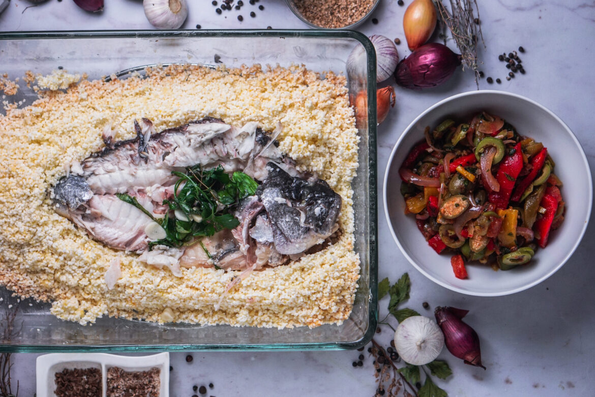 - Zwiebeln und Knoblauch in einer Pfanne andünsten, erst Paprika und dann die Tomaten mit dazugeben, Kapernäpfel/Estragon hacken und zusammen mit Salz und Pfeffer kräftig abschmecken. Peperonata auf Tellern anrichten, den Fisch aus dem Salzteig holen und dazu servieren, fertig!