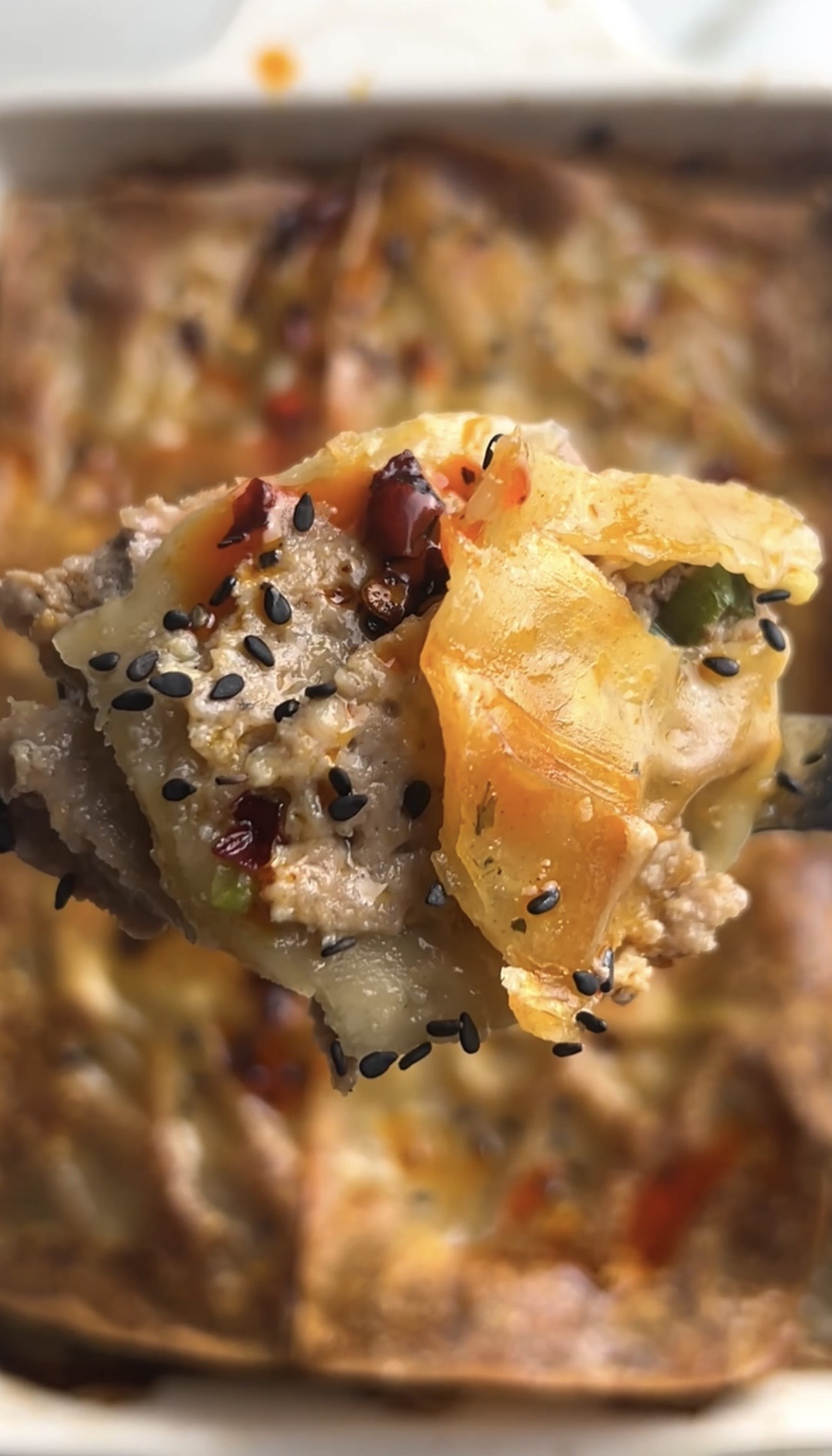 Diese Dumpling-Lasagne kombiniert saftiges Hackfleisch mit Wantanblättern zu einem unglaublich einfachen Ofengericht.