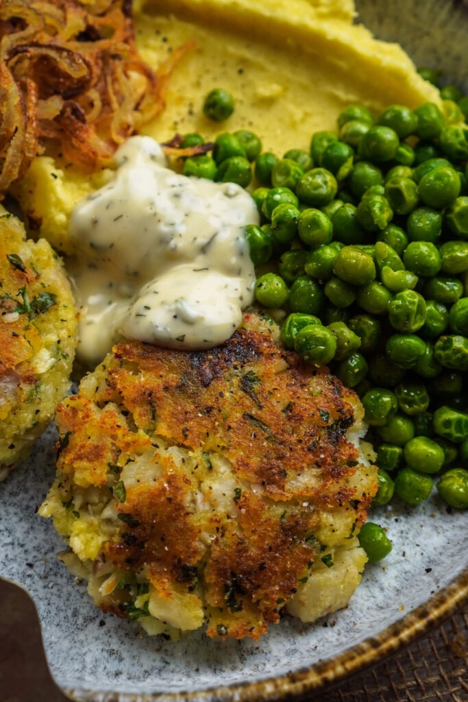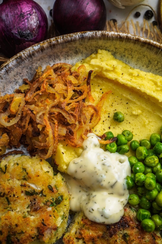 - Ca. 1/4 der Kartoffeln durch eine Presse drücken und mit zum Fisch in die Schüssel, kräftig mit Salz und Pfeffer würzen, dann 4-5 Frikadellen formen und in einer Pfanne mit etwas Öl von beiden Seiten goldbraun braten.
