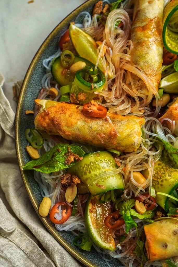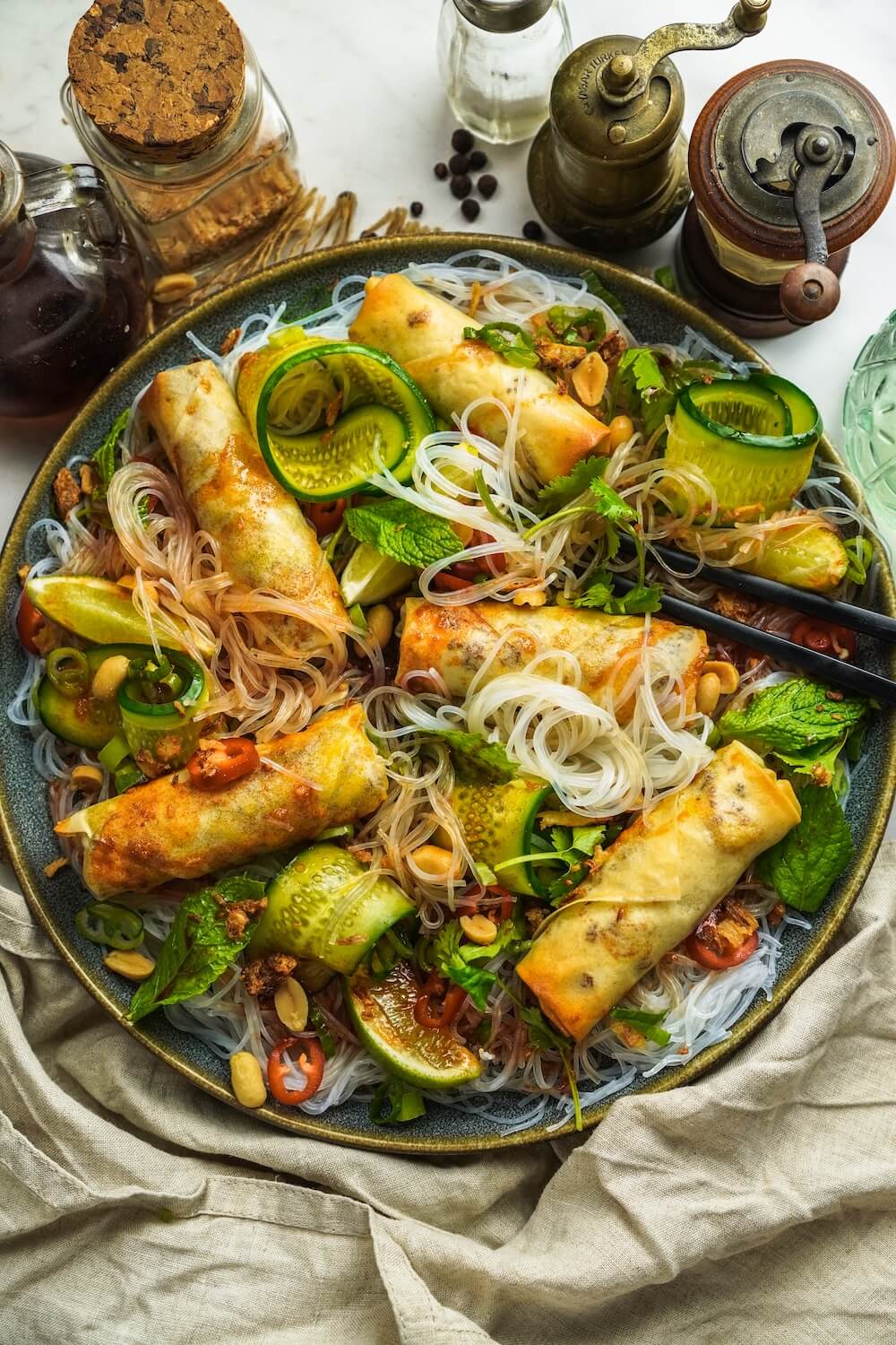 Ein Teller voller Glasnudel Salat, mit vielen verschiedenen Toppings und goldbraunen Frühlingsrollen