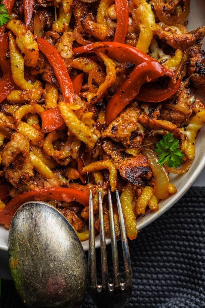 Paprika waschen, in Streifen schneiden und mit in die Pfanne. Frische Spätzle mit dazu und alles 3-4 min weiter braten bis alles schön gebräunt ist.