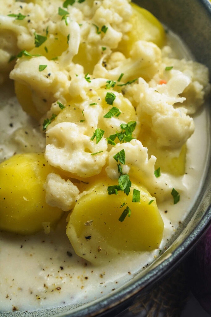 - Nun Abwechselnd ein wenig Milch und Blumenkohl-Brühe angießen, mit dem Schneebesen verrühren und wiederholen bis die Soße dick cremig ist. Schmeckt sie noch etwas nach Mehl, muss sie weitere 5-10 Minuten köcheln.