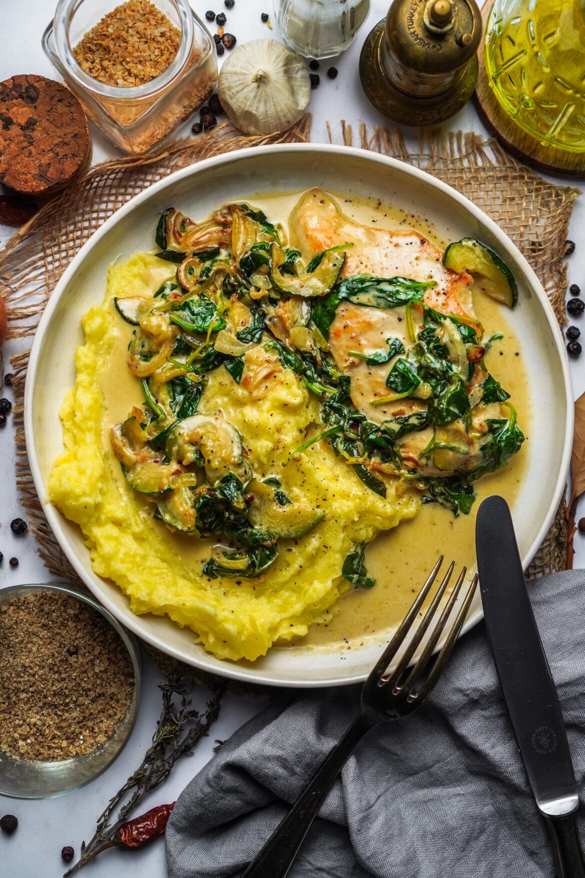Hey Leute, ich hoffe euch geht’s gut 🙂 Hier gibts heute mal wieder ein leckeres Hähnchen Gericht aus der Pfanne mit cremigen Kartoffelpüree – total einfach gemacht und in ca. 30 min fertig!