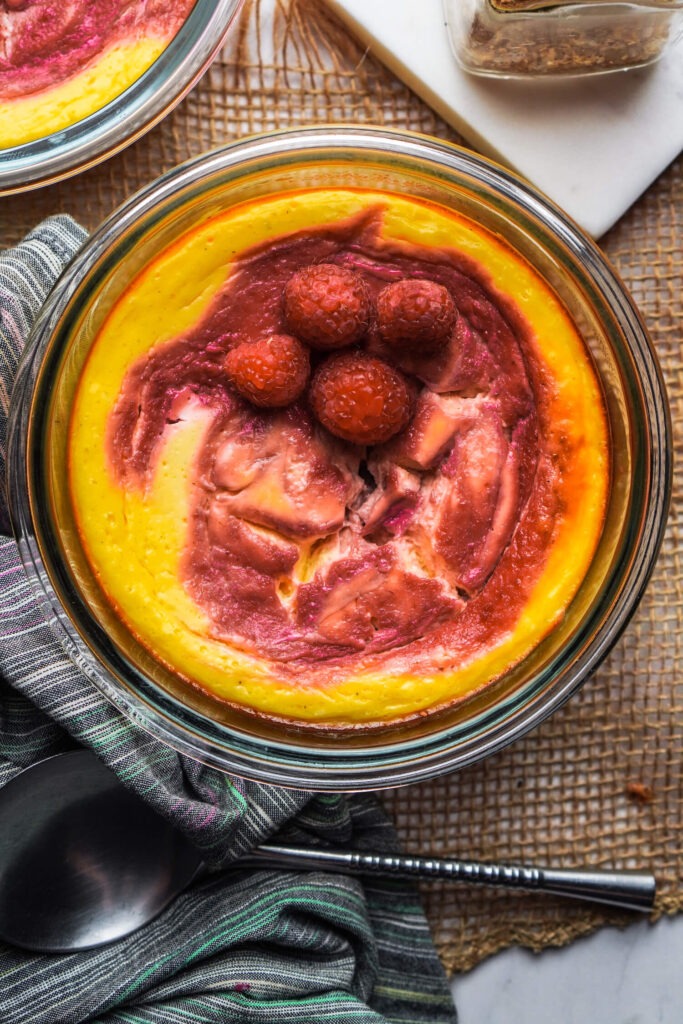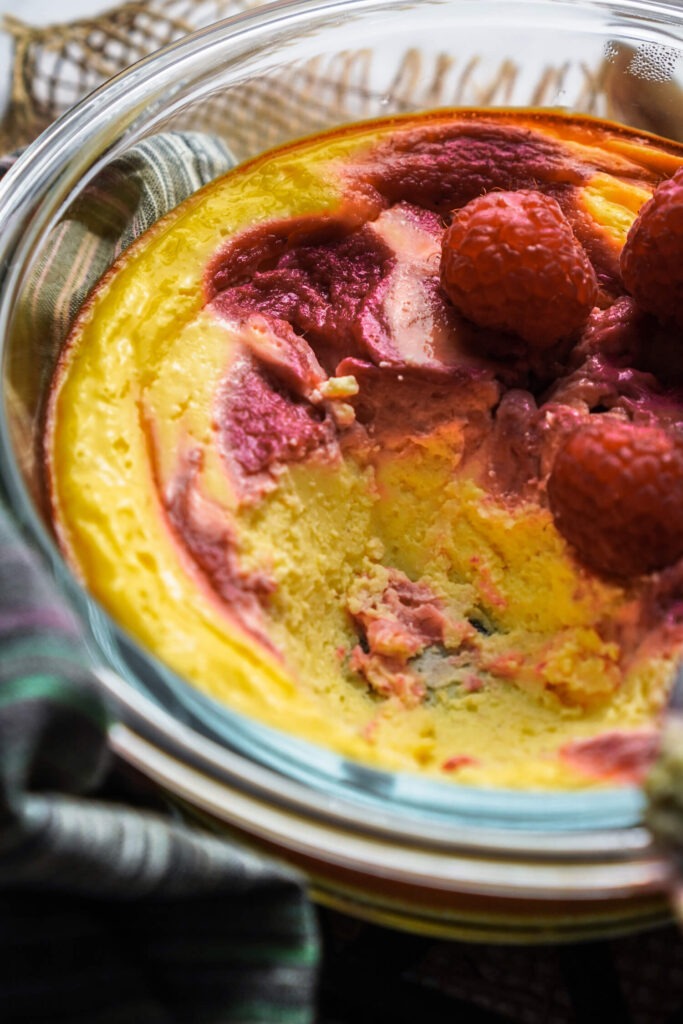 Als erstes alle Zutaten bis auf die Himbeeren miteinander verrühren und in einer ofenfeste Form füllen. Meine ist eine Glasdose mit Tupperdeckel, so kann man das Ganze nach dem auskühlen einfach mitnehmen!