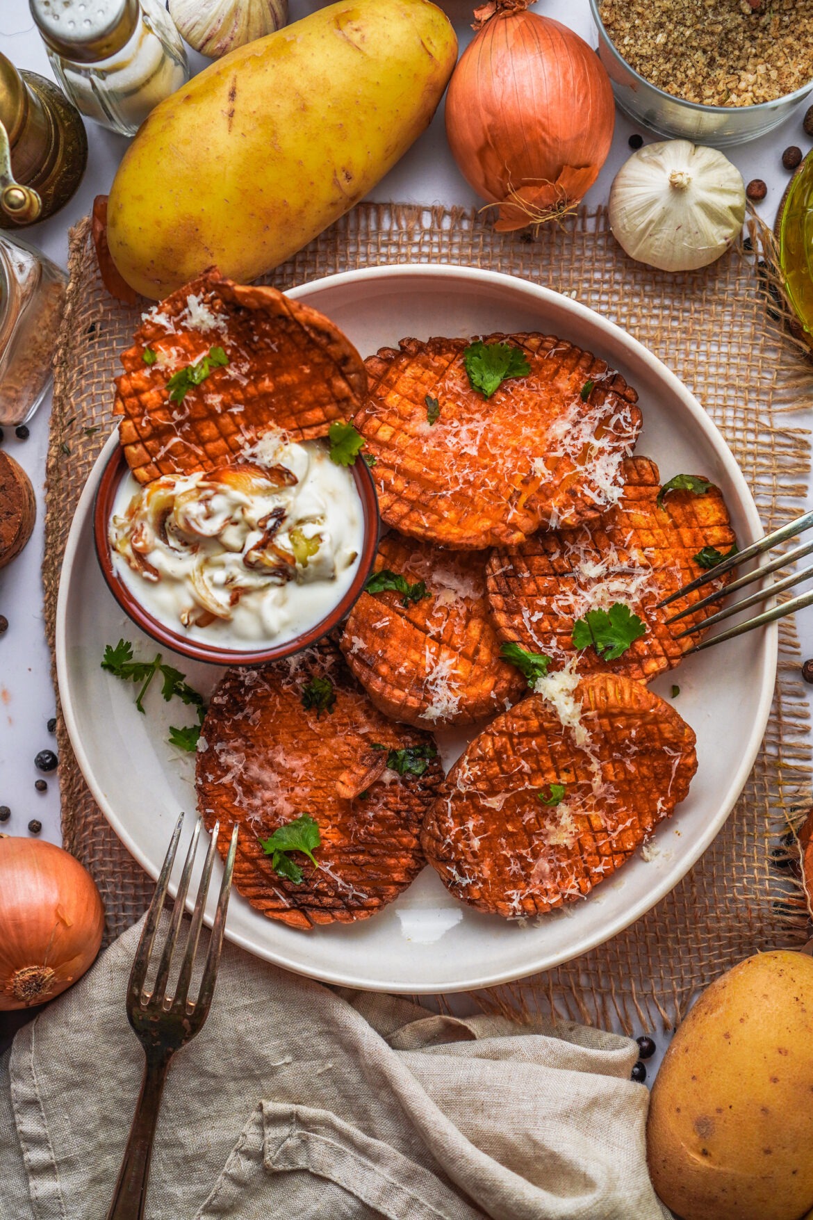 - Die Kartoffeln waschen, mit Schale in dicke Scheiben schneiden und über Kreuz einritzen. Das geht am besten mit 2 Holzspießen daneben, sodass man nicht ganz durchschneiden. Wie das genau aussieht sieht man auf meinem Instagram Kanal im Video (Reel) direkt neben dem Post zu diesen Kartoffeln!