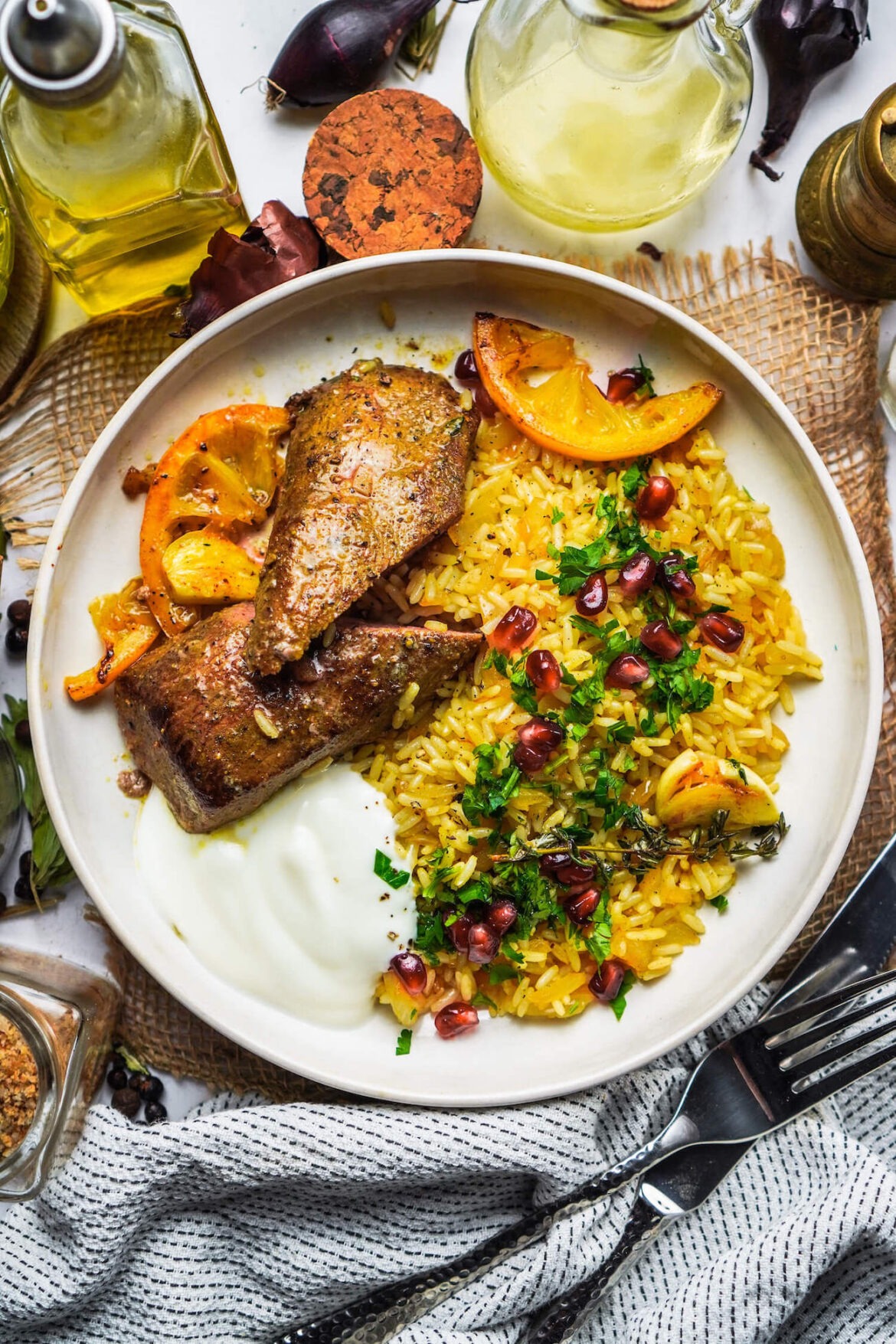 - Nach 7-8 min Reis auf Tellern verteilen, Granatapfel und Petersilie oben drauf. Lamm anschneiden und mit Knoblauch und Zitrone zum Reis, fertig!
