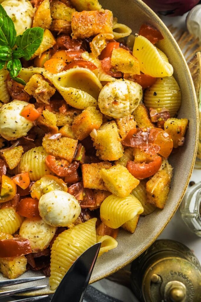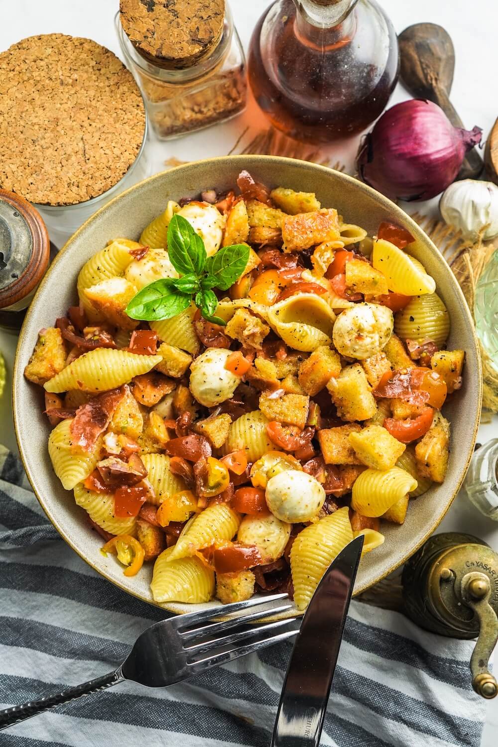 Generell bin ich nicht der größte Fan von Nudelsalaten, aber besonders die Kombination aus knusprigen Croutons, Serrano Schinken und dem generellen Geschmack von „Bruschetta“ im Mund ist einfach top!