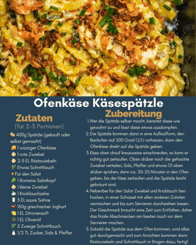 Sobald die Spätzle aus dem Ofen kommen, wird alles gut durchgemischt und zum Anrichten kommen dann Röstzwiebeln und Schnittlauch in Ringen dazu, fertig!