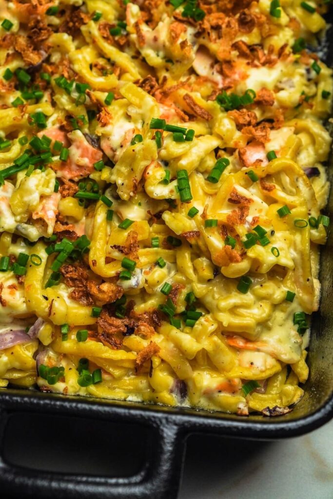 - Sobald die Spätzle aus dem Ofen kommen, wird alles gut durchgemischt und zum Anrichten kommen dann Röstzwiebeln und Schnittlauch in Ringen dazu, fertig!