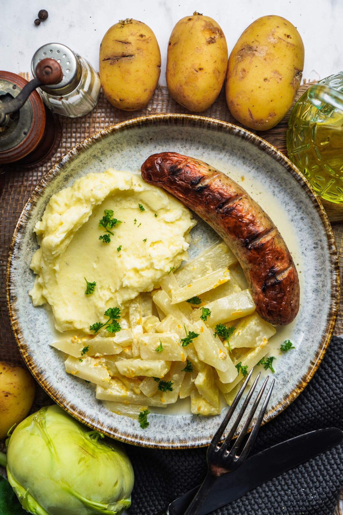 - Bratwurst braten / grillen, alles zusammen anrichten, fertig!
