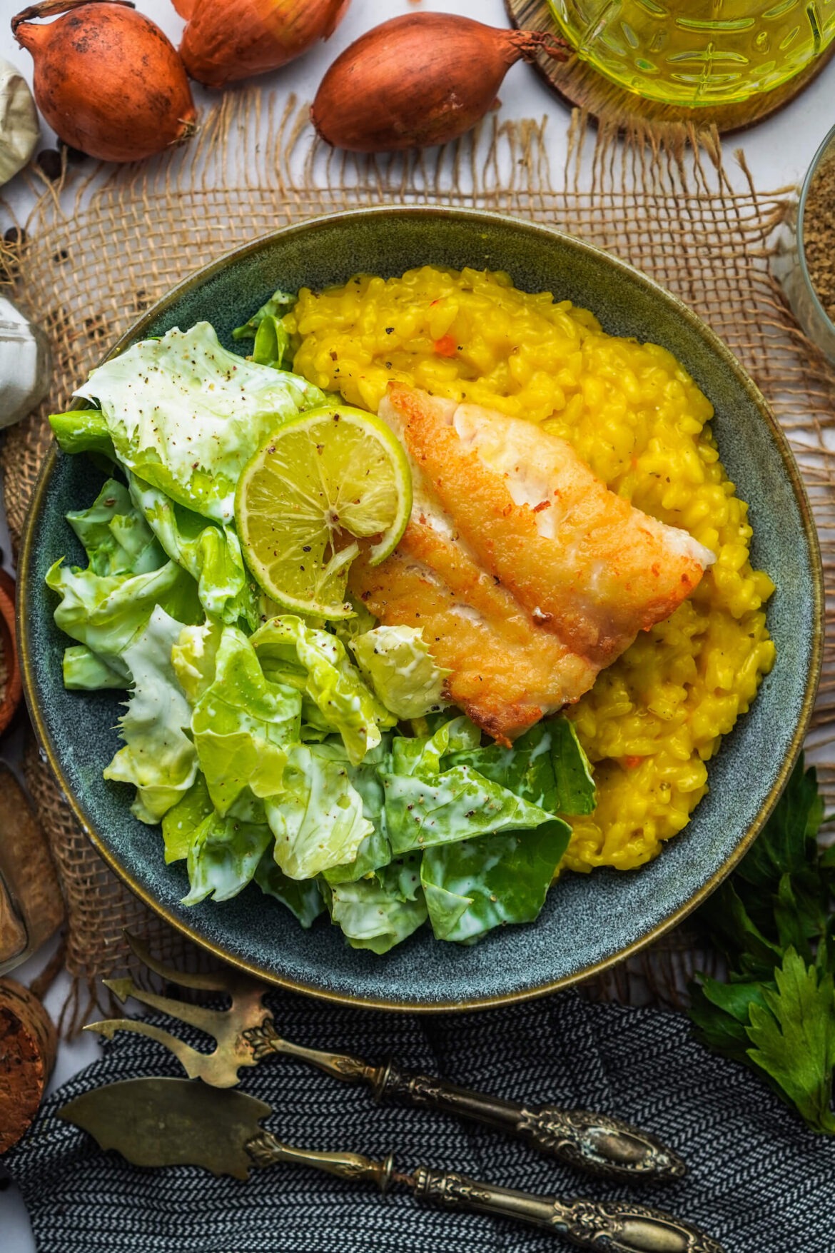 Hier gibt’s heute ein leckeres Safran Risotto mit nem Fisch und frischem Salat – total lecker 🙂