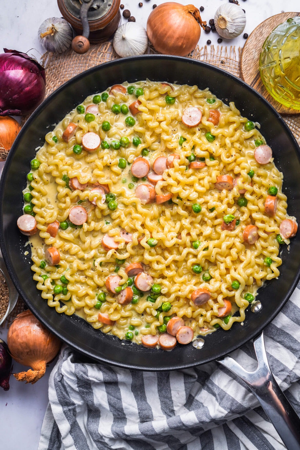 - Sahne angießen, aufkochen und die Gewürze mit dazu, Schmelzkäse darin auflösen. Die Erbsen können auch gefroren in die Soße, Würstchen kleinschneiden und ebenfalls mit rein.