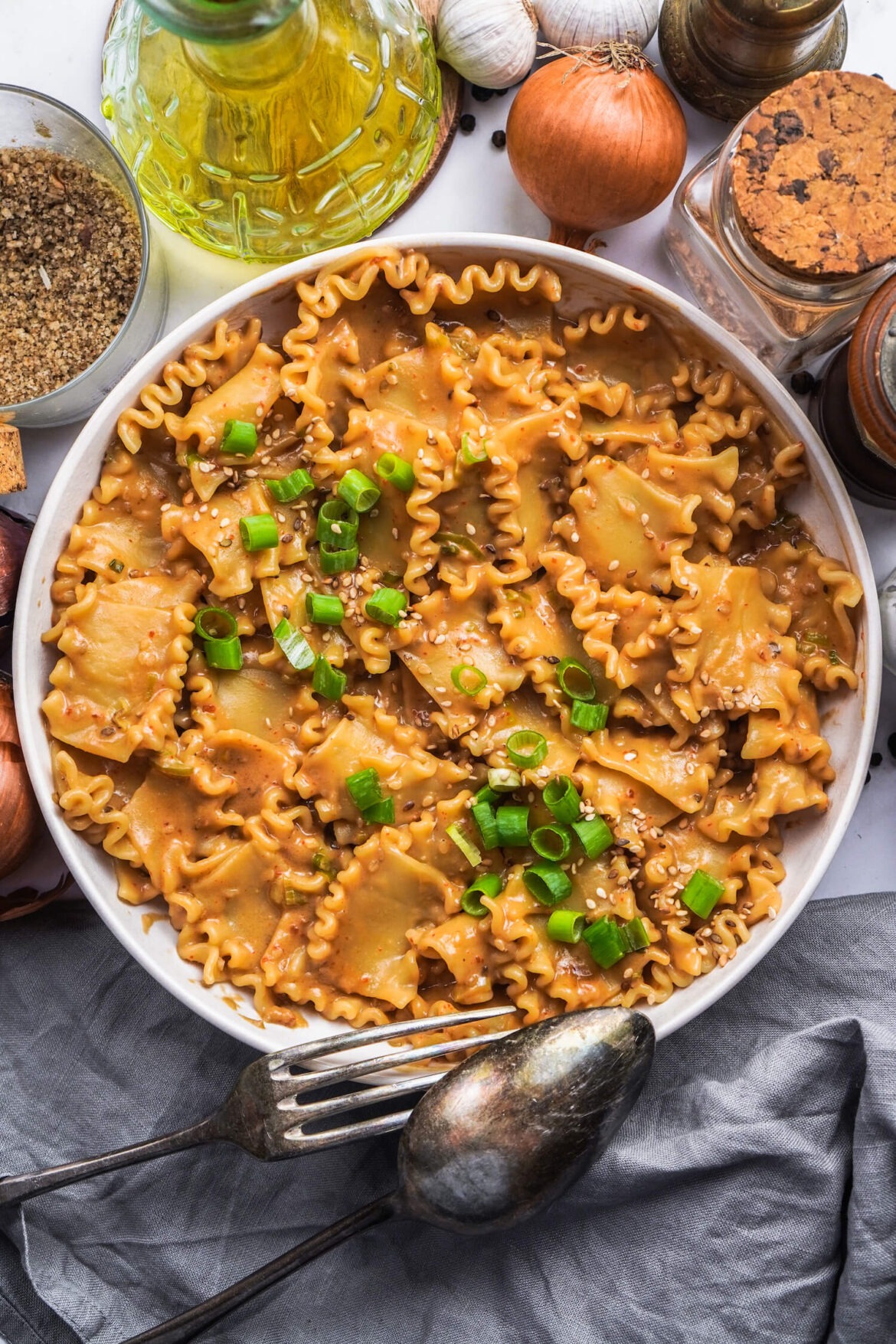 - Soße angießen und aufkochen, eine Kelle Nudelwasser dazu (durch die Stärke der Nudeln, gibt das nochmal Bindung), mit Salz und Pfeffer abschmecken und zur gewünschten Cremigkeit einkochen. Nudeln mit in die Soße, durchmischen, grüne Frühlingszwiebel Ringe oben rauf, fertig!