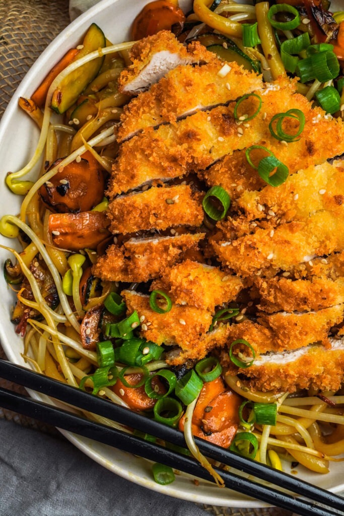 - Hähnchen in einer zweiten Pfanne mit Öl von beiden Seiten goldbraun braten, Soße zu den Nudeln geben und alles abschmecken. Zusammen mit Frühlingszwiebel Ringen und etwas Sesam anrichten, fertig!