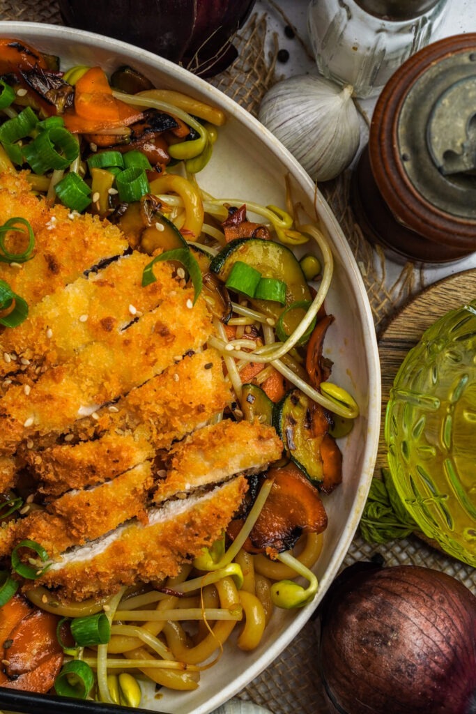 – 3-4 EL Panko Paniermehl (ist gröber, wird knuspriger – gibt’s auch im Asia Supermarkt, Edeka, Rewe..)