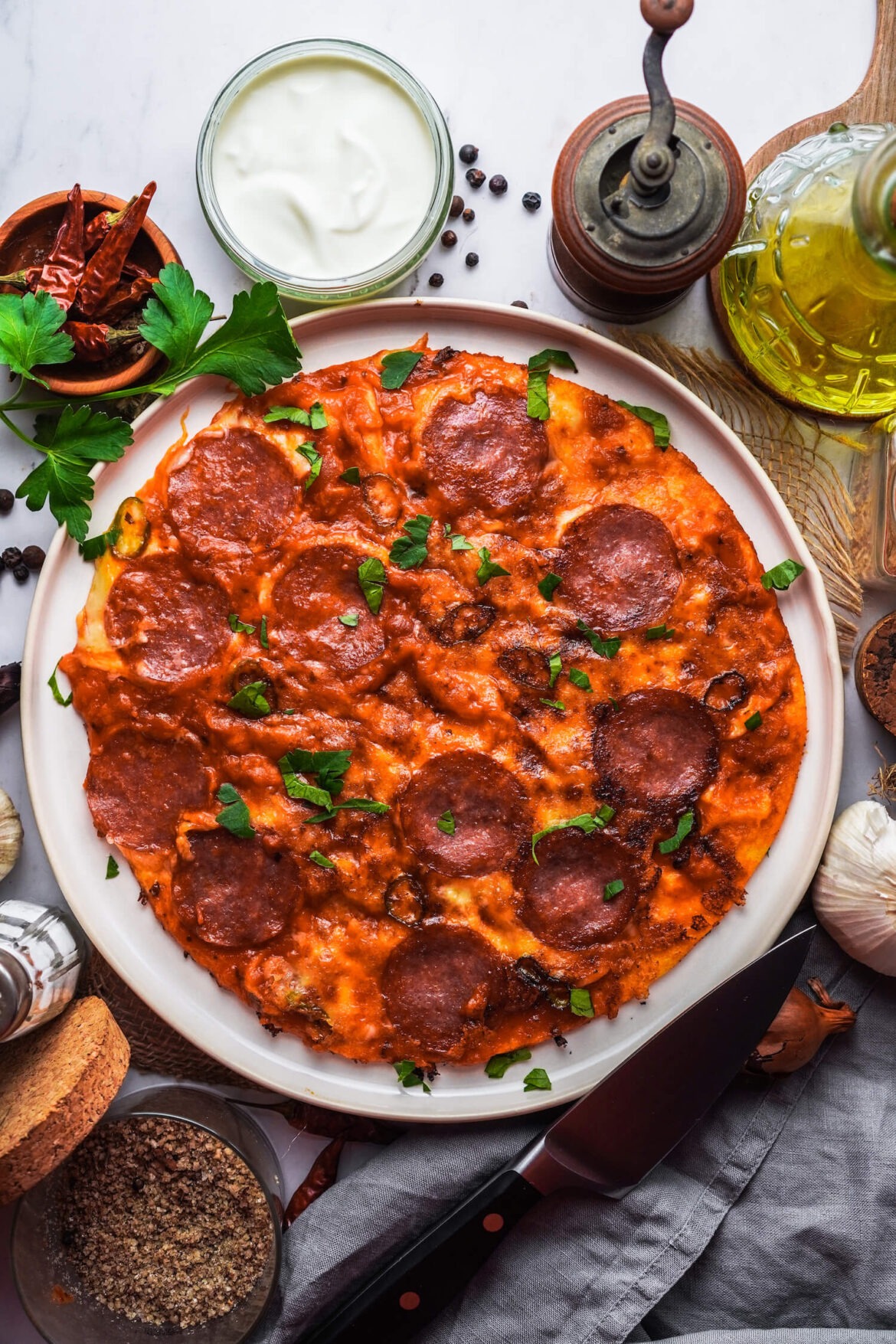 Upside Down Pfannenpizza mit Salami und Peperoni